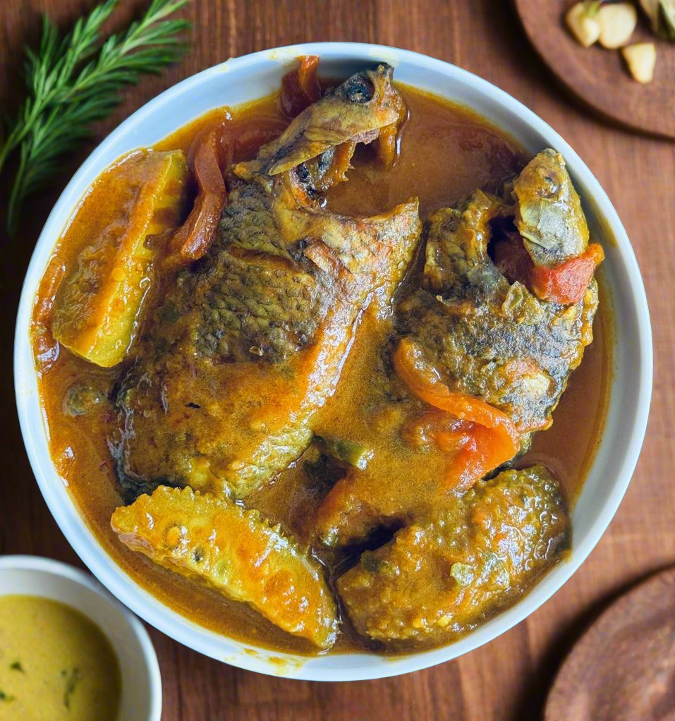 Koi fish cooked with chili, onion, seasonal vegetable and traditional Bangladeshi spices