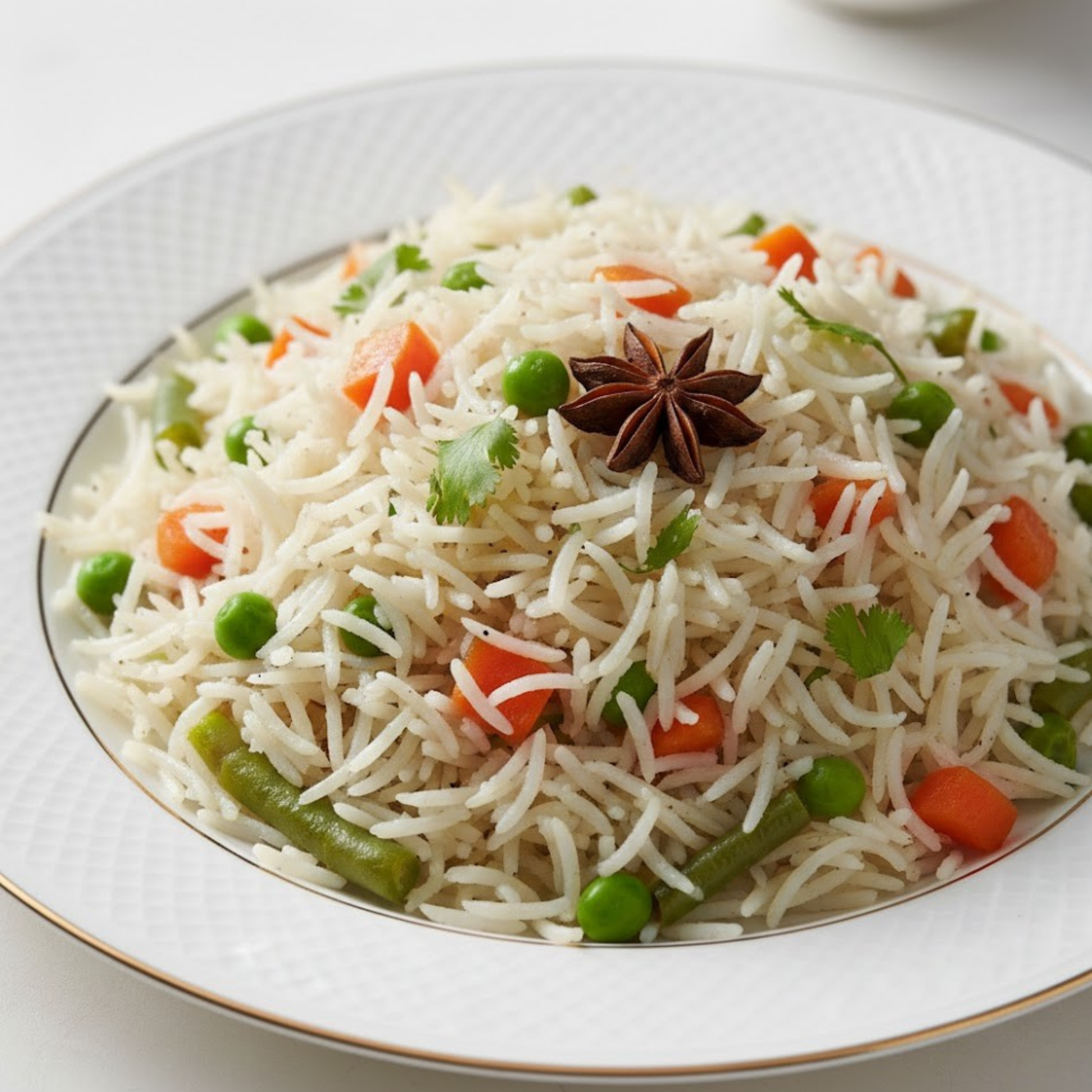 A simple yet elegant dish of aromatic basmati rice cooked with clarified butter (ghee), whole spices like cinnamon and cardamom, and a touch of salt. Each grain is perfectly separate, fluffy, and carries a subtle, buttery fragrance that enhances any curry it accompanies.