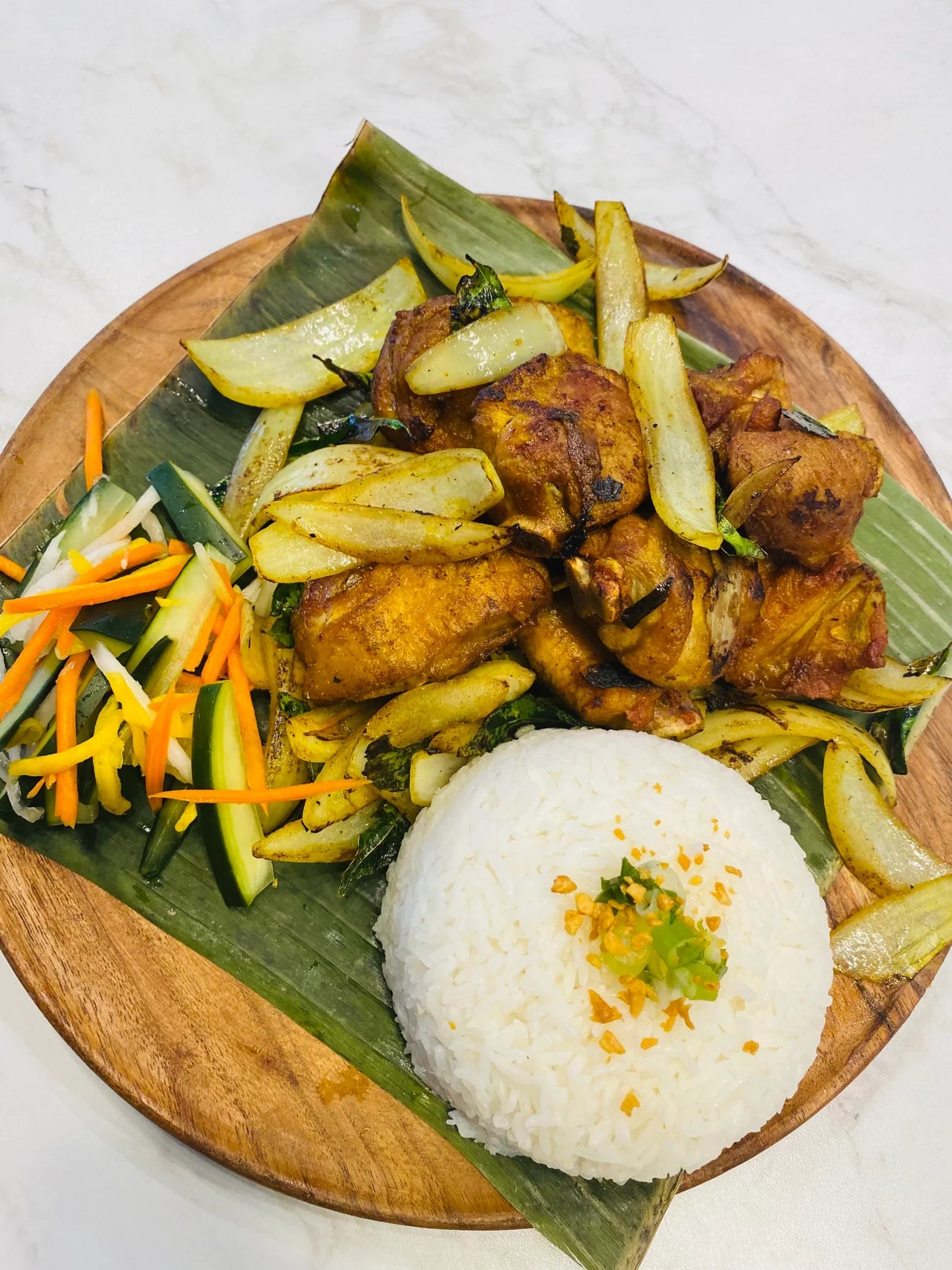 Marinated turmeric, onion, curry leaf, fried then sauteed, with white rice